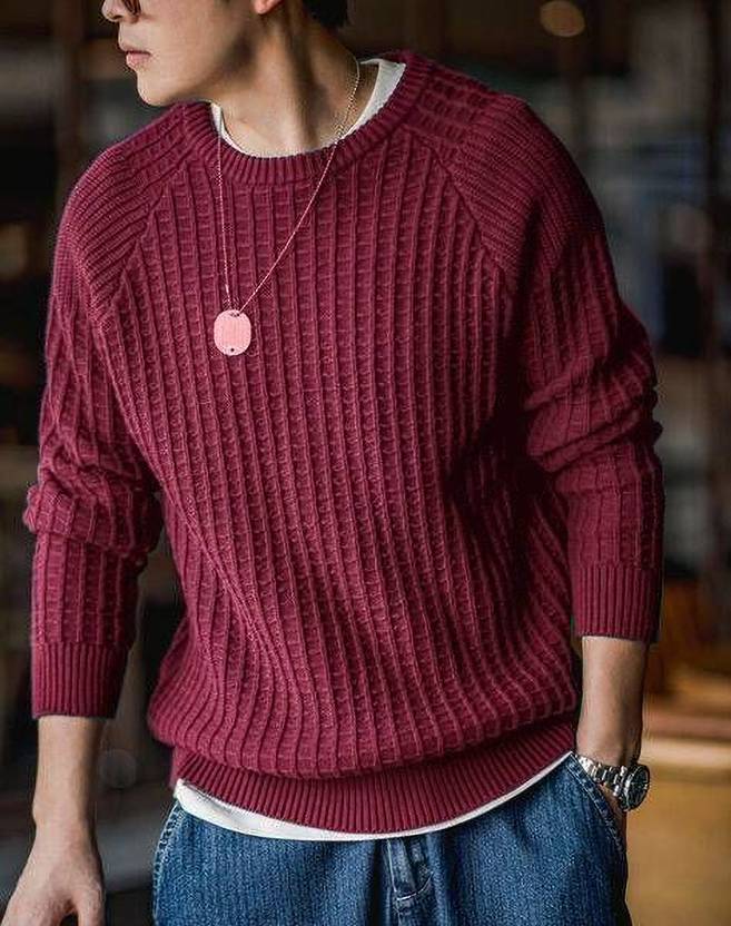 Men Self Design Round Neck Wool Blend Maroon T-Shirt