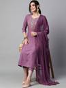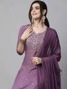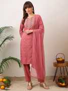Offering an embroidered pattern and solid patterned pants, this women's kurta, pants, and dupatta set showcases a harmonious blend of artistry and sophistication. Also, the intricately embroidered pattern on this kurta adds a touch of ethnic charm, while the solid patterned pants contribute to a contemporary and elegant look.