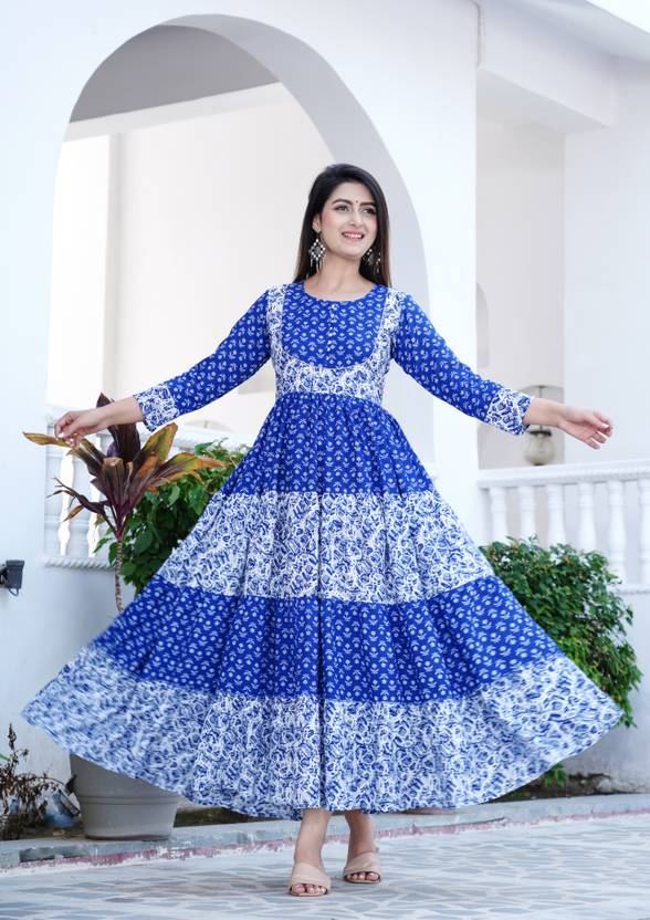 fastal look Women Printed Anarkali Kurta (Blue, White)