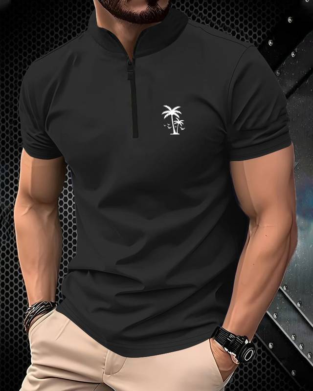 Men Solid High Neck Cotton Blend Black T-Shirt