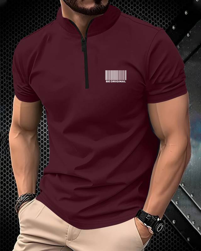 Men Solid High Neck Cotton Blend Maroon T-Shirt