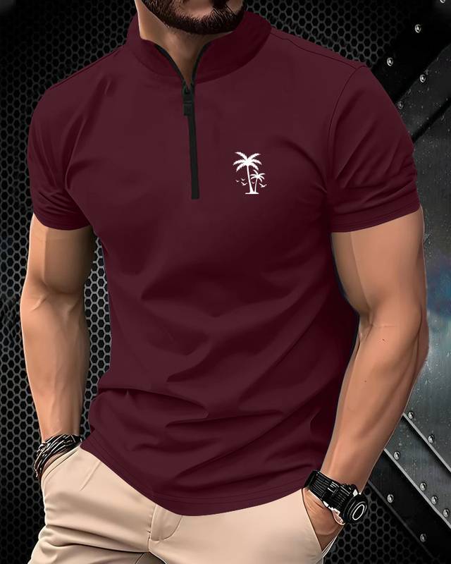 Men Solid High Neck Cotton Blend Maroon T-Shirt