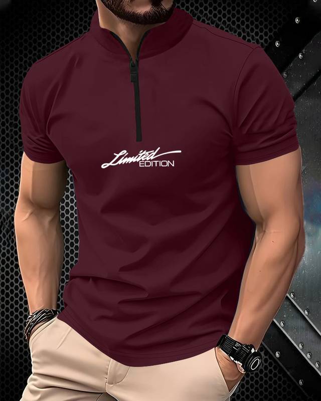 Men Solid High Neck Cotton Blend Maroon T-Shirt
