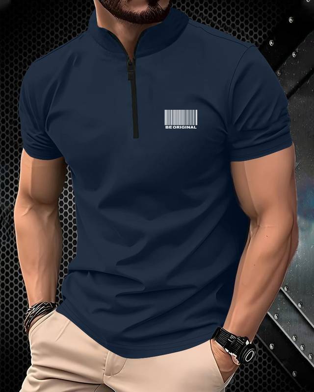 Men Solid High Neck Cotton Blend Navy Blue T-Shirt