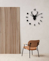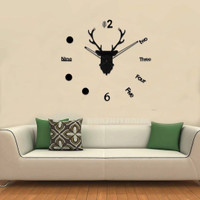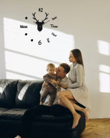 Featuring a central clock mechanism adorned with a stag head and antlers, this analogue wall clock presents a deconstructed layout with separate numbers and hour markers arranged directly on the wall. Some hours are written out in words while others are indicated by simple dots, creating a visually engaging 3D effect. The no-frame installation allows flexible placement on walls of varying sizes, making it suitable for living rooms, bedrooms, kitchens, offices, hotels, and bars.