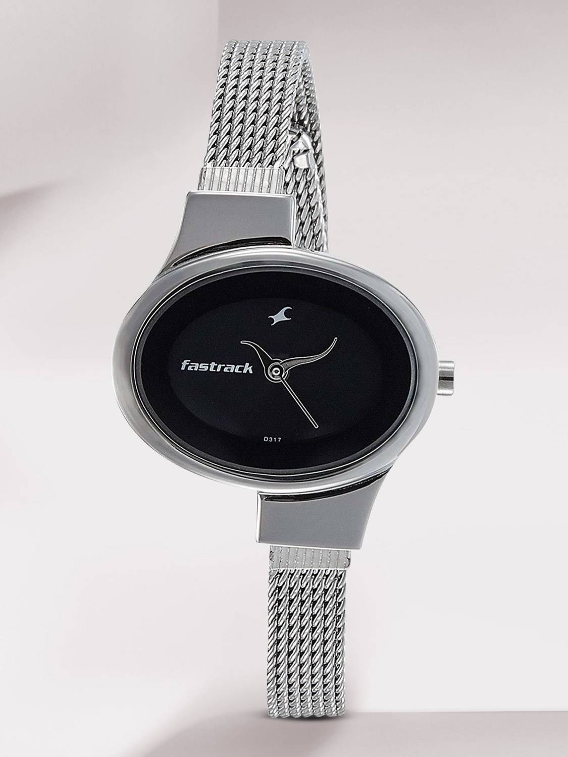 Flaunting an oval-shaped dial with a stainless steel back case, this watch comes with a uber-cool metallic bracelet-like strap that sits beautifully on your wrist, as it closes into a deployment clasp.