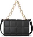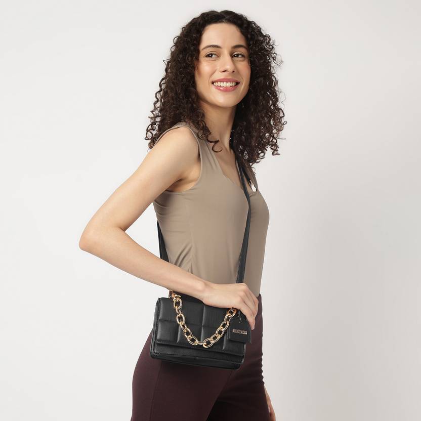 Designed in soft faux leather with a clean quilted finish, it features a sleek button closure and a metal chain accent that adds just the right amount of edge. Whether you're dressing up or keeping it casual, this sling slips seamlessly into every look.