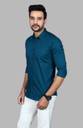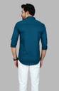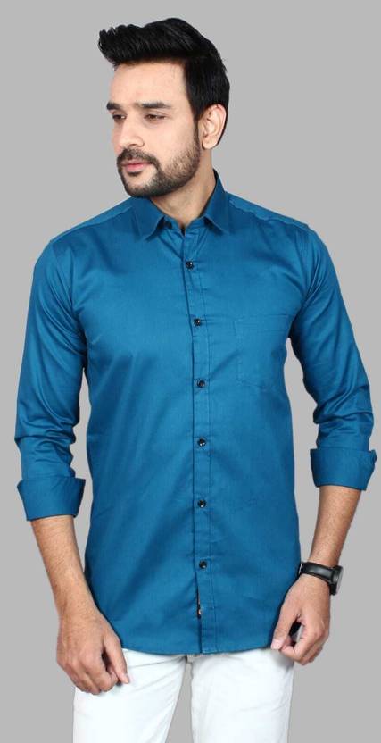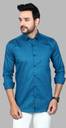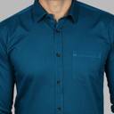 This is a men's navy blue, full-sleeved shirt featuring a classic collar and a button-down front. It includes a single patch pocket on the left chest. The sleeves are styled rolled up to the forearms, and the shirt is made from a smooth, solid-colored fabric, offering a clean and versatile look. This shirt can be paired with jeans, chinos, or trousers for various casual to semi-formal occasions.