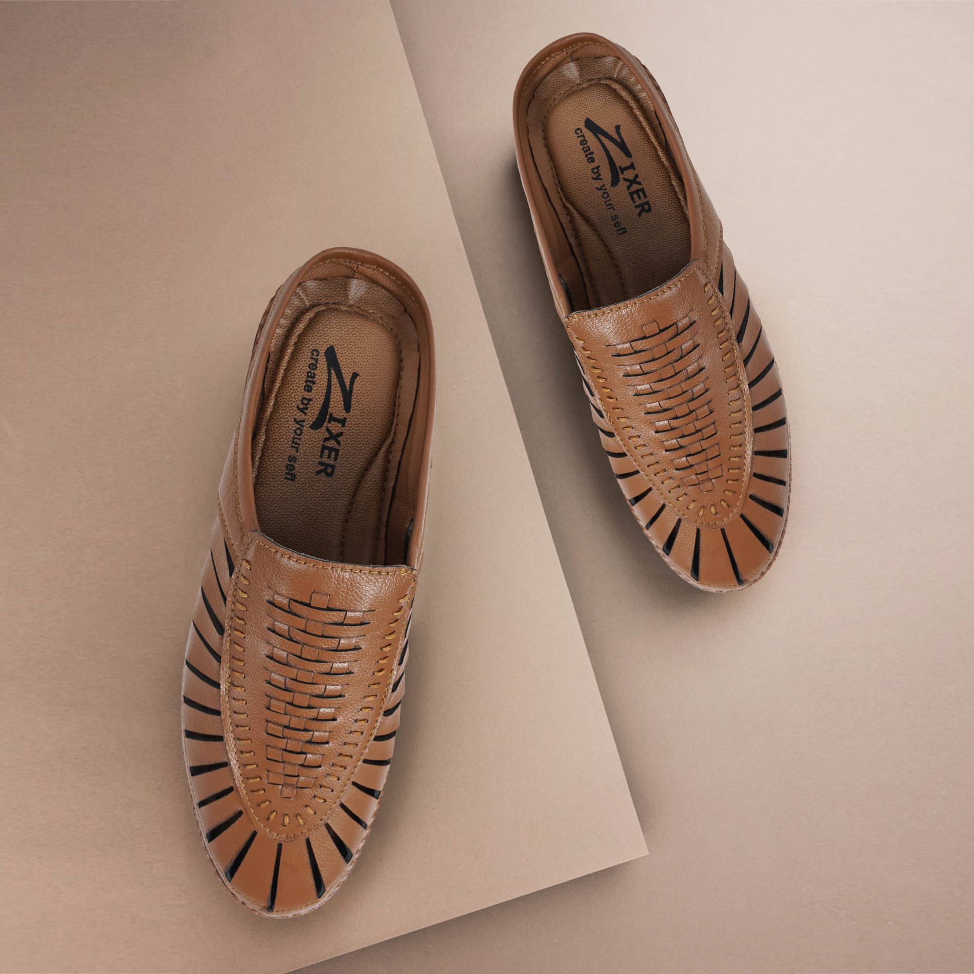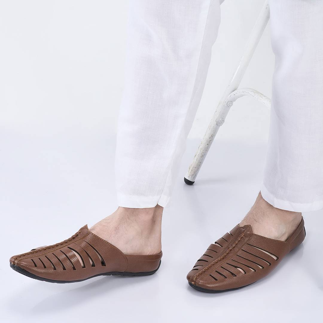FAUSTO Laser Cut Design Back Open Evening Party Slip On Shoes Mojaris For Men (Tan , 6)