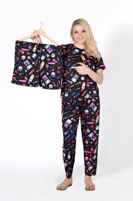 FAYDAMALL Women Printed Black Night Suit Set