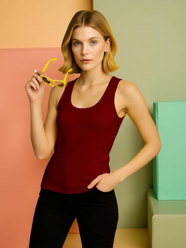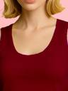 Maroon tank top in soft, ribbed cotton jersey with a deep, round neckline at the front. Made with soft, breathable, and stretchable cotton fabric, this sleeveless top gives a snug yet flexible fit, making it perfect for casual outings, layering, or even as activewear