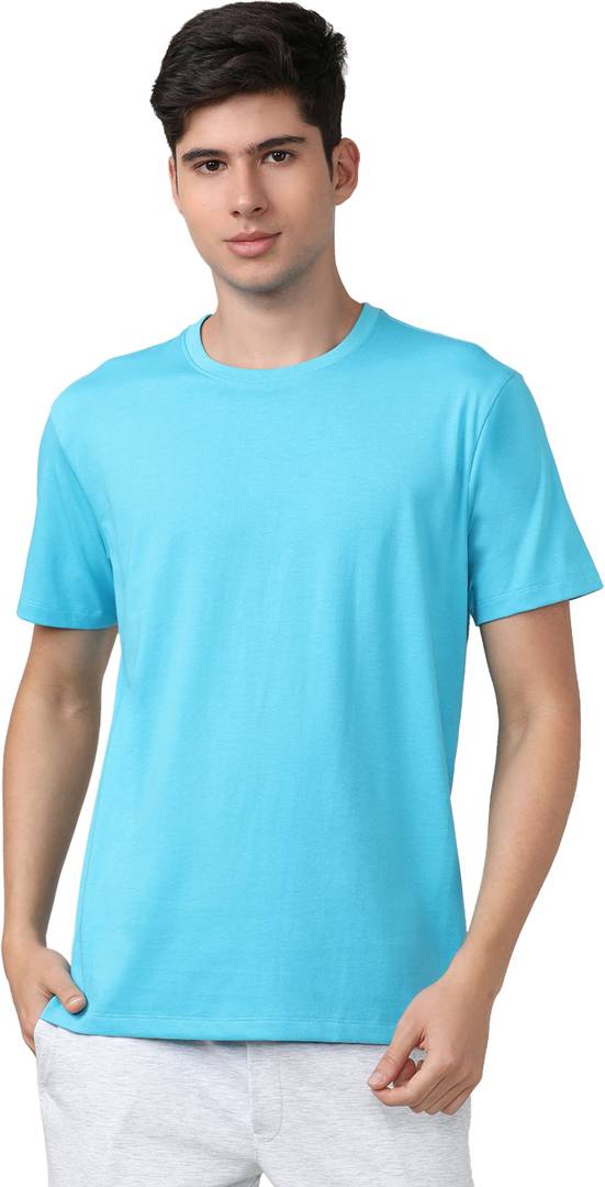 FCUK Men Solid Crew Neck Cotton Blend Blue T-Shirt