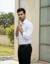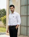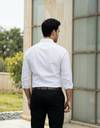 A slim-fit, long-sleeve formal shirt in a light, solid white color, featuring a classic point collar, front button placket, and a single chest pocket with a small rectangular logo tag for subtle branding. The fabric appears smooth and crisp, giving a clean, polished look suitable for office wear or smart-casual occasions.