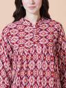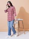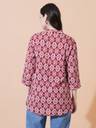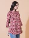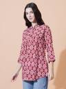 Printed Style Women Top with Mandarin Neck Collar and third Quarter Sleeve, Rayon Fabric, Treading Printed Sylish Top, Fabric and Print Quality is superb, Hip Length Curved Hemline Top.