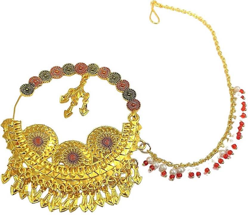 Nath is very Good Look Gold .Every bride shares the similar passion for adorning Nathuli on her wedding, whether it’s Garhwal or Kumaon. Highly revered for its beautiful stonework and particular use of Kundan.This nath (Nose ring ) has designed for traditional womens . It has brash metal base with multi color red & white stone. Basically Uttarakhand Nath is a type of nose ring which connect with a chain. On uttarkhand jewellery the Nath is very important and this nathiya show face of Uttarakhand tradition. In uttarkhand the nathiya are many type but mostly more head nath and tihari nath is very famous between the uttarakhandi community. Quality Product By Febtech