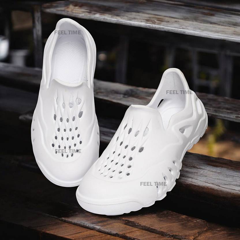 These white slip-on sandals are designed for comfort and versatility, featuring a lightweight and waterproof construction. The upper is perforated with multiple holes, providing excellent breathability and quick drainage, making them ideal for wet environments or warm weather. They have a sturdy, textured sole that offers good grip. The design is simple and functional, perfect for easy wear. Compatible products include: swimwear, shorts, casual dresses, athletic wear, beach bags, and casual tops.