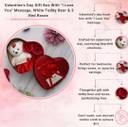 Attractive red color with ribbon detailing, Soft plush teddy with “I Love You” tag, Heart-shaped premium gift box, Decorative artificial roses inside