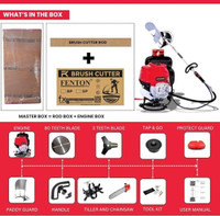 This brush cutter machine set includes everything needed to get started: the machine, rod, engine, 80 T and 3 T blades, tap and go, protect guard, paddy guard, and handle. Additional items include a tiller, chainsaw, toolkit, and user manual for easy operation and maintenance.