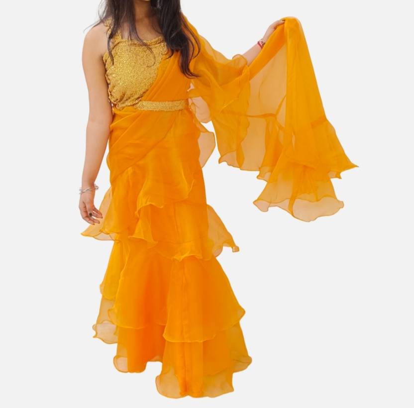 Ready to wear ruffle saree give you classy look with sequence work blouse , it's a free size saree , this saree will be fit waist size 28 to 34 Plzzz share your feedback it will be help me to improve my quality if you find any not good ... Also if you like this saree must give me rating ??