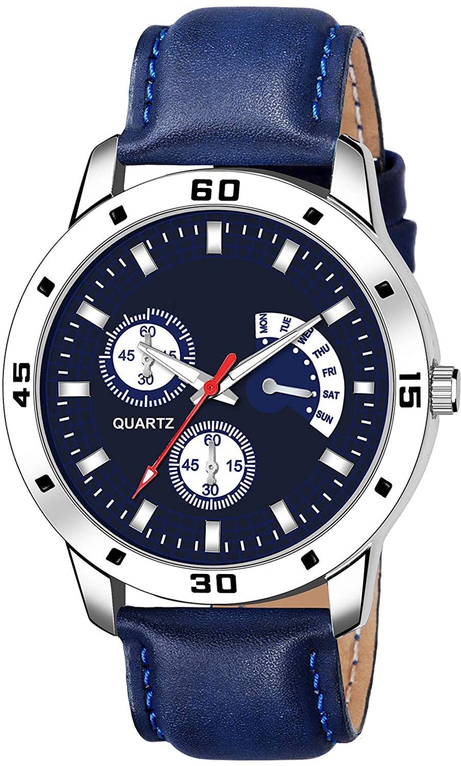 MEN_144 BLUE LEATHER BELT NEW ARRIVAL ROUND DIAL ANALOG QUARTZ WATCH FOR MEN
