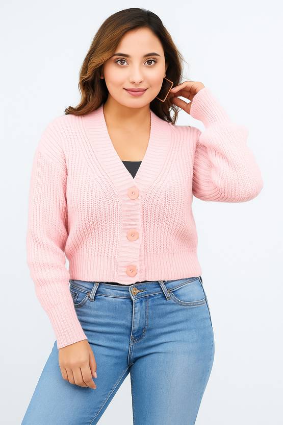 FEVERFEW Self Design V Neck Party Women Pink Sweater