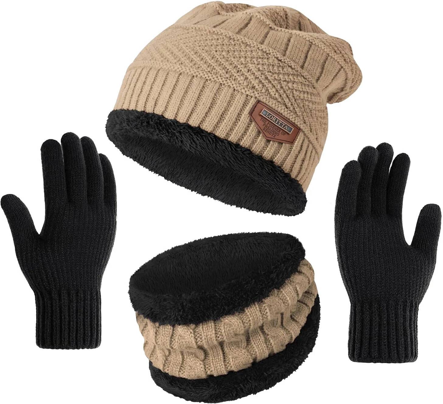 [MATERIAL]: Thermal spun acrylic knit & fleece lining. The inner is made of artificial wool. Very soft and cozy, hand-knitted feel, close to the skin, giving you lasting warmth and softness. [3-IN-1 WINTER ACCESSORIES]: You can use this multi-function beanie hat, scarf, and gloves set together or separately as you will. It will keep your head, ears, face, neck and hand warm. Stay warm all the time, great for outdoor activities, and daily warmer, great for outdoors. [WARM FLEECE LINING]: Different from most women's and men's beanie, scarf, and gloves set, our hat, neck warmer, and gloves set has thick soft fleece lining, enjoy extra warmth and protect you in the cold winter. [UNISEX & ONE SIZE FITS ALL]: We use stretchable materials so that the hat, scarf, and gloves can adapt to various head shapes, neck sizes, and hand sizes, whether small head or big head even basketball head. They are easy to wear or take off, combine plenty of stretch and a snug fit, and are suitable for most women and men. [PACKAGE INCLUDE]: You will get 1 knit beanie hat, 1 knit scarf (neck warmer gaiter), and 1 pair of gloves, to protect your boys and girls all-around from the cold winter.
