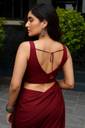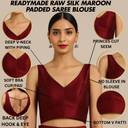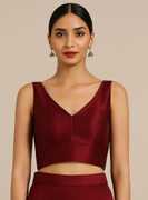 Elevate your ethnic wardrobe with this premium maroon silk blouse, designed for the modern Indian woman who values elegance and versatility. Crafted from smooth, high-quality silk, this sleeveless V-neck blouse features a flattering V-patti hemline that adds a contemporary twist to traditional styling.