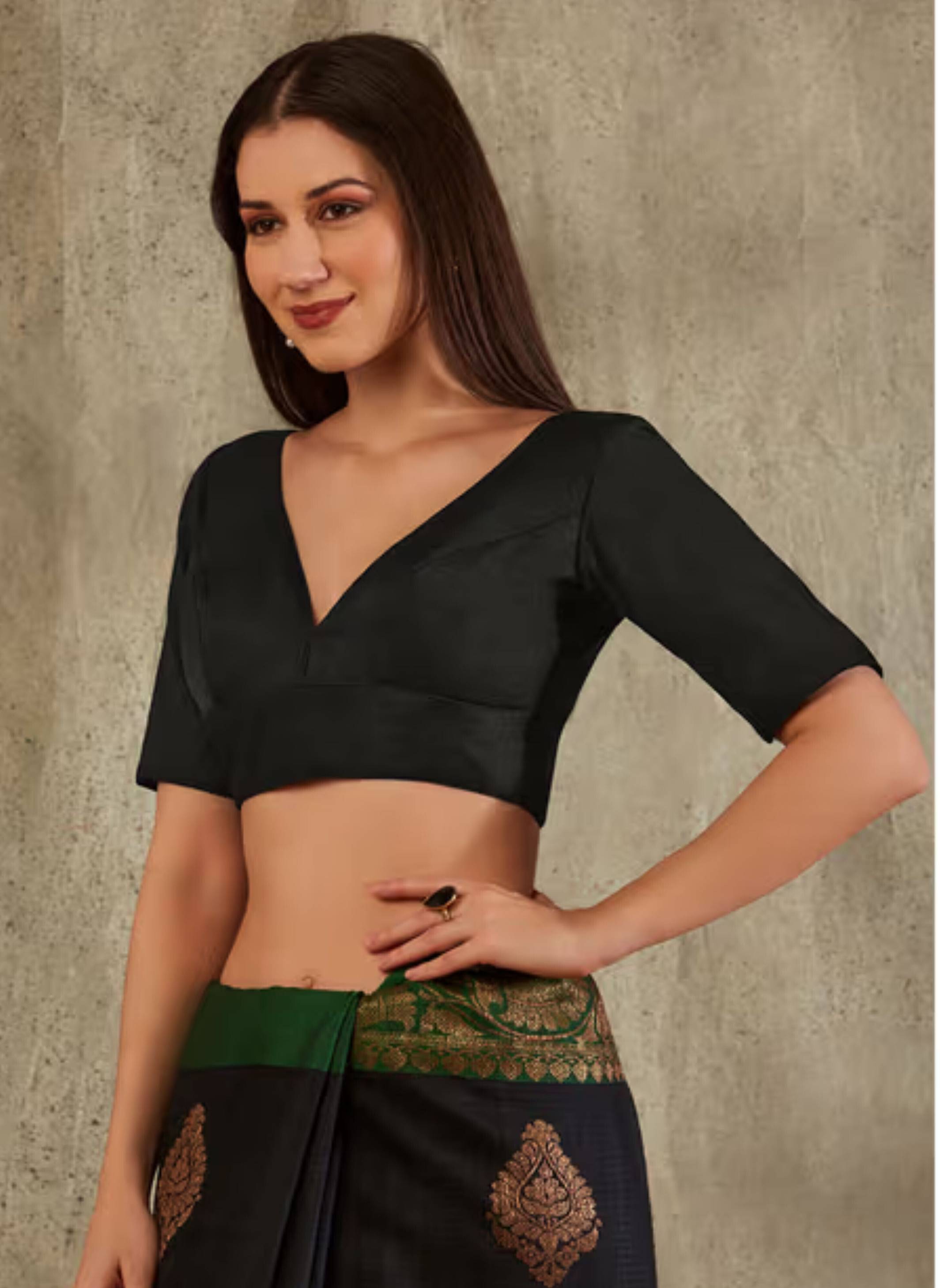 Elevate your ethnic wardrobe with this luxurious black silk V-neck blouse, designed to blend timeless elegance with modern comfort. Crafted from premium silk fabric, this blouse features a sleek V-neckline that flatters all body types and adds a touch of sophistication to any saree ensemble.