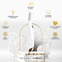 The new Gold Standard in facial hair Removal and exfoliation from finishing touch Lumina Lumina flawless. Flawless Glo is designed like the professional-grade devices used by estheticians and board-certified dermatologists. They do not use Vibrating Dermaplane devices because they do not yield the same level of precision and control as a static, non-vibrating dermaplaning wand. You will experience similar results to an in-office dermaplaning treatment. This at-home tool gently purifies skin of dead cell build-up and fine facial hair to reveal a bright, youthful-looking complexion. By removing the surface layer of dead cells, dermaplaning allows products to fully Soak into the skin which boosts the efficacy of the serums and creams you already own. With regular use, skin is left smooth, soft, and luminous. This unit comes with 6 replacement heads as it's recommended you dispose of the head after a full use. For a flawless feel and a flawless finish - you can trust finishing touch Lumina Lumina flawless Dermaplane Glo. Suitable for men and women of all ages!