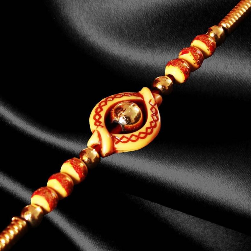 Designer FWN*02 Gold Finish Rakhi, Chawal Roli Pack Set (1 Rakhi, 1 Roli Chawal Pack)