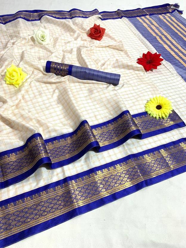 fionnenterprise Checkered Daily Wear Cotton Silk Saree (White)