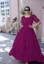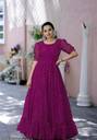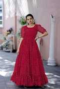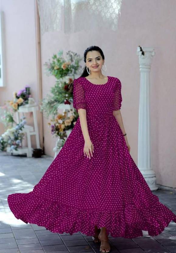 Designer Georgette Dot printed Gown from. Best Use For Special Occasion And Office Wear Collections. Designed With Absolute Perfection, Team It With Modern Accessories And Stunning Flats To Create A Contrasting Effect. It is a must have dress for any women . Size :- S(36”),M(38”),L(40”),XL(42”),XXL(44”) Sleeves :- Fancy Puff Sleeves Length :- 56 Inch Flair :- 4.5 Meter Lining(Inner) :- Cotton (full up to bottom) NECK TYPE :- fancy Round Neck Stitching:- Standard Stitching with Frills