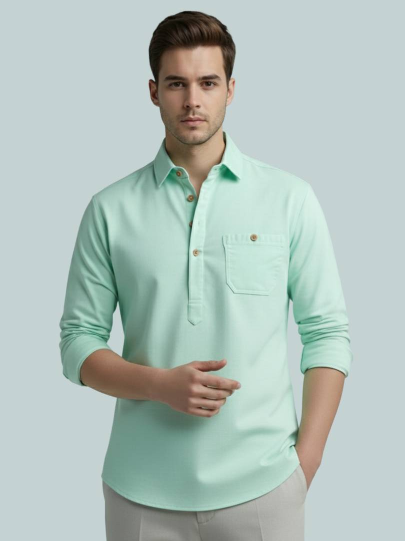 This Cotton Blend Short Kurta is perfect for men who value style and comfort. Its versatile design makes it ideal for any occasion—festivals, parties, or casual outings. Product Details ?? ????? Gender: Men ?? Pattern: Solid ?? Design Type: Plain ?? Closure: Button ?? Sleeve: Full Sleeve ?? Waist Rise: Mid-Rise ?? Hemline: Curved ?? Fabric: Cotton Blend ?? Product Length: Short ?? Material & Care ?? Fabric: Cotton Blend Wash: Suitable for hand wash and machine wash. How to Style ?? Pair it with dark-wash denim or linen trousers for a casual look. Dress it up with a pair of churidar or slim-fit pants for festive occasions. Add leather sandals or loafers and a wristwatch for a classy finish. Regular the sleeves for a relaxed vibe during daytime events. This shirt kurta seamlessly blends traditional elegance with modern styling, making it a wardrobe essential for every man! ??