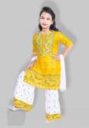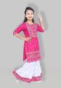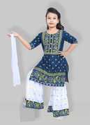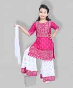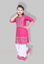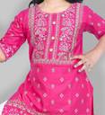 fIRST dREAMpresent a beautifully handcrafted Kurta And Straight Pant Set for Girls. It made with cotton Linen, has three quater sleeves, round neck, mop button closure, is knee length and has straight hem. The kurta is highlighted with embellished singhara border on neck and hemline. Comes with matching straight pant on elasticated waistband.