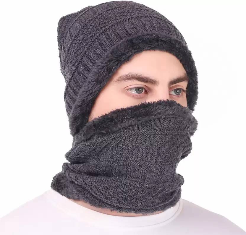 Fur Cap with Neck Scarf, Unisex Winter Woolen Beanie Cap and Stylish Neck Warmer Combo Set, Snow Proof with Inside Soft Warm Fur Knit Hat Scarf for Men & Women (Free Size) Cap