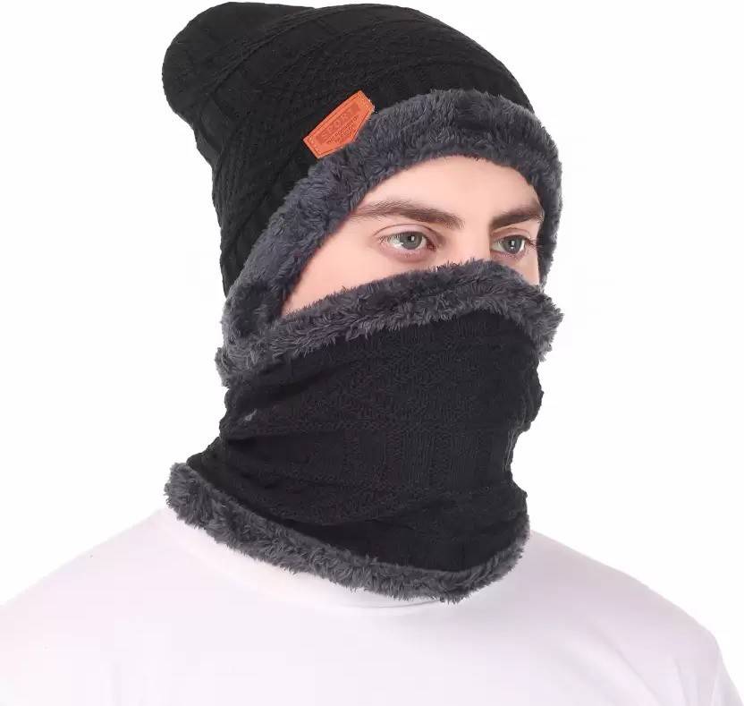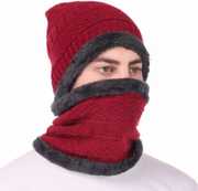 Fur Cap with Neck Scarf, Unisex Winter Woolen Beanie Cap and Stylish Neck Warmer Combo Set, Snow Proof with Inside Soft Warm Fur Knit Hat Scarf for Men & Women (Free Size) Cap