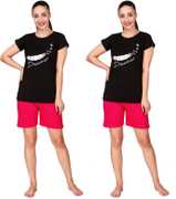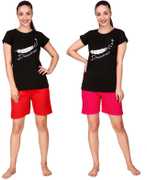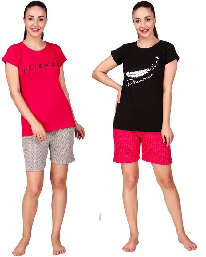 Top & shorts nightsuit set simply and sleep simply in our smart and charming top and Shorts nightwear set. round neck T-shirt crafted finely in rich cotton fabric to give that ease while sleeping. Paired along with a black floral patterned for giving your legs the warmth it needs.