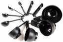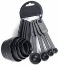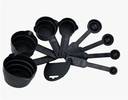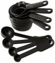 thick hard wearing black stack able measuring cups, with double pour sides Perfect kitchen accessory. All come stacked together on a O ring Thumb rest on each handle Sizes Each cup has several different sizes From Smallest To largest Cup 1 - 1/4 cup, 1/8 cup, 4 table spoons, 2 tablespoons Cup 2 - 1/2 cup, 1/4 cup, 8 tablespoons, 4 tablespoons Cup 3 - 2/3 cup, 1/3 cup, 10 2/3 tablespoons, 5 1/3 tablespoons Cup 4 - 1 cup, 1/2 cup, 1/4 cup, 16 tablespoons, 8 tablespoons, 4 tablespoons 4 Stack-able Measuring spoons 1/4 Teaspoon 1/2Teaspoon 1 Teaspoon 1 Tablespoon NOTE - PRODUCT COLOURS MAY VARY FOR DELIVERED PRODUCT. RETURNS FOR COLOUR ISSUE WOULD BE CANCELLED.