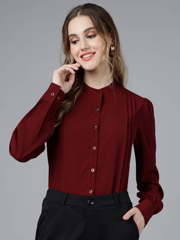fithub Women Solid Formal Maroon Shirt