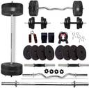 PVC Weight Plates + 2 Dumbbell Rods + 1 Bend Rod 3ft + 1 Straight rod 3ft + Gym Gloves Pair + 1 Hand Gripper + 1 Skipping Rope.