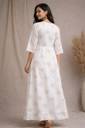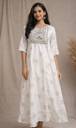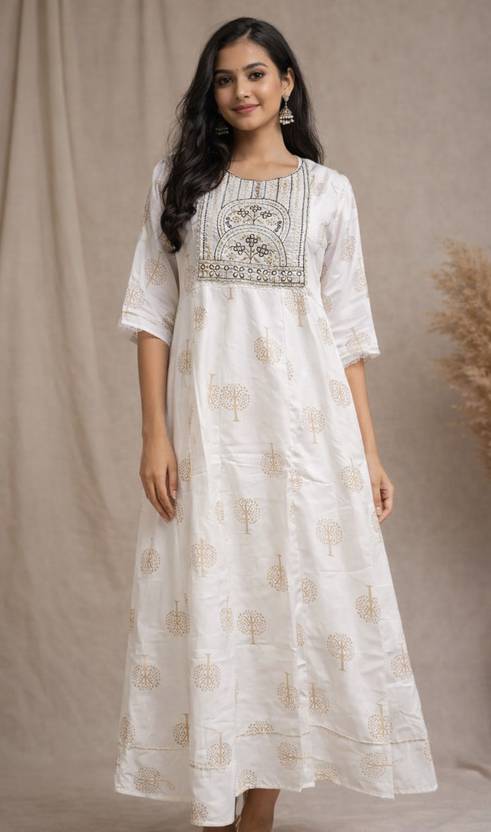 Upgrade your ethnic wardrobe with this elegant White Cotton Printed Gown for Women, designed for comfort and timeless style. Crafted from soft, breathable cotton fabric, this gown features a graceful flared silhouette with beautiful all-over traditional prints. The three-quarter sleeves and neatly detailed yoke add a refined ethnic charm, making it perfect for daily wear, casual outings, office wear, or light festive occasions. Its lightweight fabric ensures all-day comfort, especially during summer. Pair it with flats or ethnic juttis for a complete, classy look. A must-have ethnic gown for women who love simplicity with elegance.