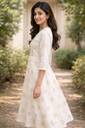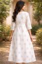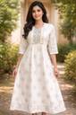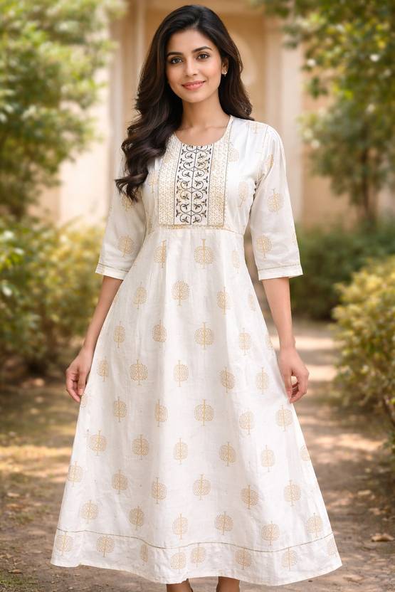 Upgrade your ethnic wardrobe with this elegant White Cotton Printed Gown for Women, designed for comfort and timeless style. Crafted from soft, breathable cotton fabric, this gown features a graceful flared silhouette with beautiful all-over traditional prints. The three-quarter sleeves and neatly detailed yoke add a refined ethnic charm, making it perfect for daily wear, casual outings, office wear, or light festive occasions. Its lightweight fabric ensures all-day comfort, especially during summer. Pair it with flats or ethnic juttis for a complete, classy look. A must-have ethnic gown for women who love simplicity with elegance.