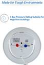 It can withstand up to 8 bars of water pressure, which makes it suitable for multi-story, high-rise buildings.