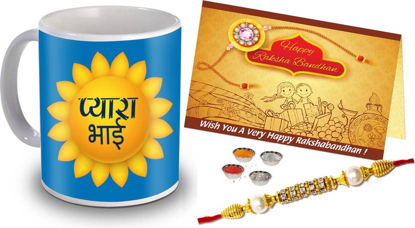 Flipkart SmartBuy Designer Rakhi Gift for Brother | Designer Rakhi | Printed Mug | Rakhi Card Gift Set – IZ20DT-11 Gold Finish Chawal Roli Pack, Rakhi, Greeting Card, Mug Set (1 Rakhi Greeting Card, Chawal Roli Pack, 1 Printed Ceramic Coffee Mug, 1 Pearl Designer Rakhi)