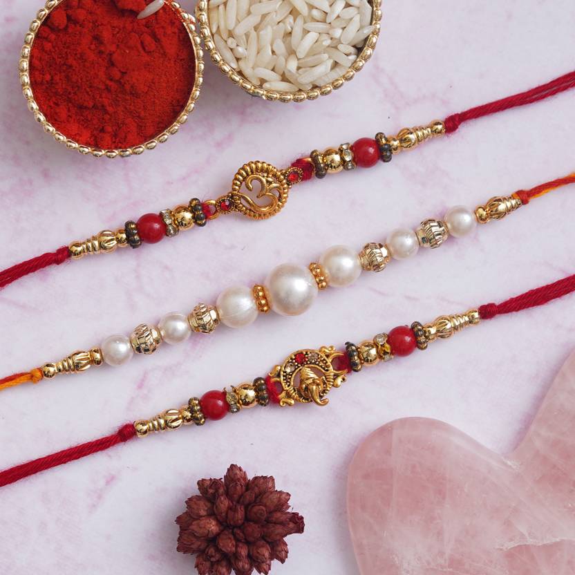 Flipkart SmartBuy Religious Rakhi Gold Finish, Pearl Chawal Roli Pack, Rakhi Set (3 Rakhi with Roli, Chawal)