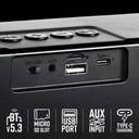 This speaker comes with a BT v5.3 for easy wireless connectivity and multiple wired alternatives such as a USB port, an AUX input, and a microSD card slot. In addition, it has a built-in FM radio, enabling you to enjoy your favourite audio content.