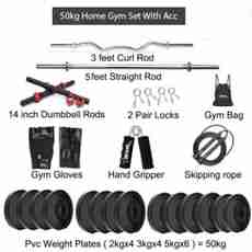 PVC'S 5kg x 6 Plates = 30kg, PVC'S 3kg x 4 Plates = 12kg, PVC'S 2kg x 4 Plates = 8kg, 30+12+8=50kg, 2 Pc Dumbbell Rod (14 inch), 1 x 3ft Rod(Curl), 1 x 5ft Rod (Straight), 4 Rod Collars (Spring), 1 x Leather Gym Gloves, 1 x Skipping Rope, 1 x Hand Gripper, 1 x Gym Bag,, 4 x Spring Lock