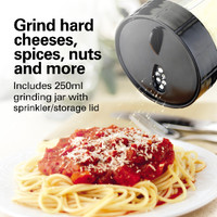 The included 250 ml grinding jar is perfect for chopping or finely grinding hard cheese, nuts, and spices. It comes with a handy shaker/storage lid, allowing you to grind, store, and serve from the same container, adding convenience to your cooking process.