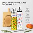 Upgrade your kitchen with this borosilicate oil dispenser that blends elegance with everyday functionality. Crafted from high-borosilicate glass, this clear glass oil dispenser features a floral printed design that adds visual appeal while offering long-lasting durability. The bottle is heat-resistant, lightweight, and ideal for daily cooking, especially in Indian kitchens where oil handling is frequent and precision is key. The 500ml capacity offers ample space for cooking oil, olive oil, vinegar, or other liquid condiments. What sets this bottle apart is its food-grade PP plastic spout, which ensures drip-free pouring, reducing mess and waste. The stainless steel lip adds a touch of modern style, while the dust-proof PS plastic cap keeps your contents safe and hygienic. Whether you're sautéing vegetables, tossing salads, or preparing marinades, this oil dispenser set of 2 (or single) offers you the convenience and aesthetics of a premium product. Engineered for ease, the bottle’s lightweight design (only 268g) ensures a comfortable grip, even during one-handed use. Refill with ease and store it confidently thanks to its leak-proof structure. This oil and vinegar dispenser set is not only functional but also a chic addition to your kitchen counter or dining table. Ideal for gifting, home use, or restaurant kitchens, this no drip oil dispenser glass set is a must-have for every modern home. Elevate your culinary space with this glass oil bottle set that delivers on both performance and beauty. Experience a clean, organized, and efficient kitchen with every pour.