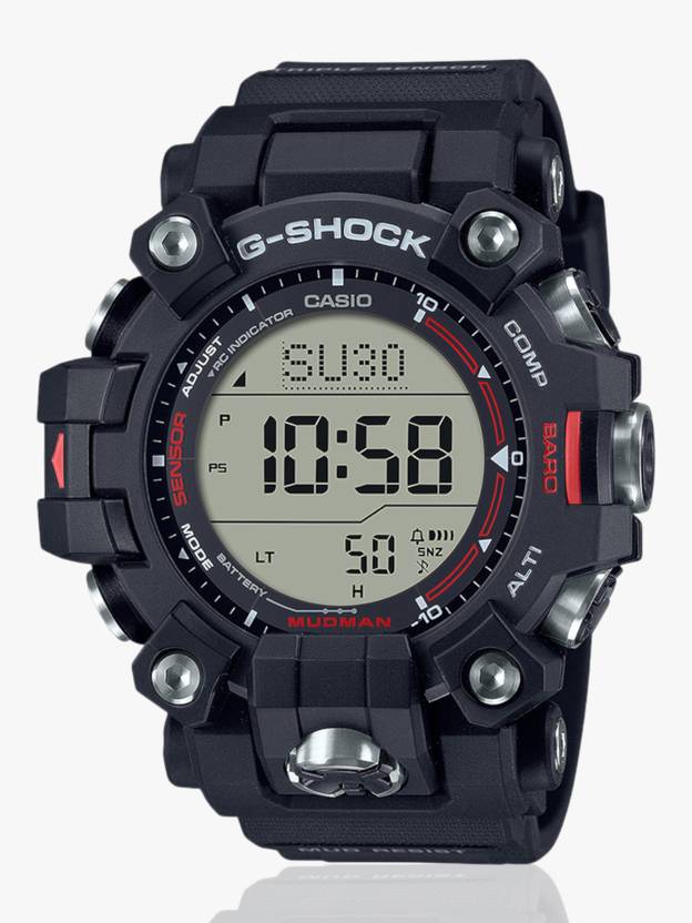 The G-SHOCK Master of G line of watches developed for professionals working in the harshest environments introduces the triple-sensor MUDMAN with mud-resist construction. The large, easy to operate front button and three direct sensor buttons on the side are shaped to drain mud and water and are protected by cylinder-shaped stainless steel components. The button shafts are equipped with gasket fittings to keep mud and dust out, as well, so youre ready to take on the toughest of terrains.